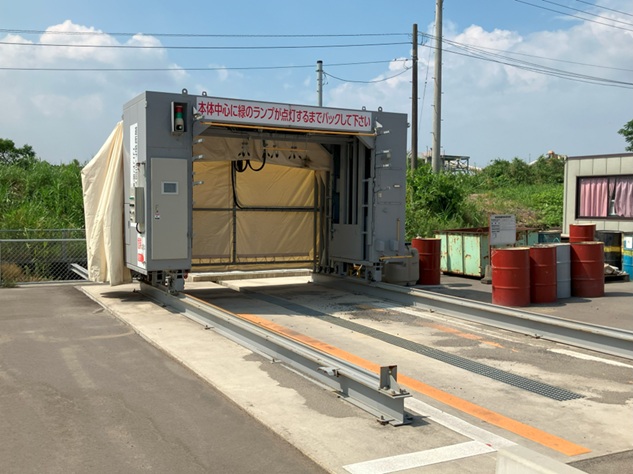 屋根付き付着防止剤塗布場(ダンプ昇降設備あり)使用済み付着防止剤はヤード内で回収